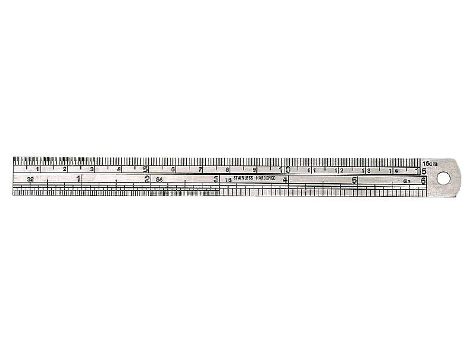 Stållineal af rustfrit stål med millimeter-inddeling langs overkanten og tomme-inddeling lags underkanten (10590-0054 kun med millimeter-inddelning). Med ophængshul.