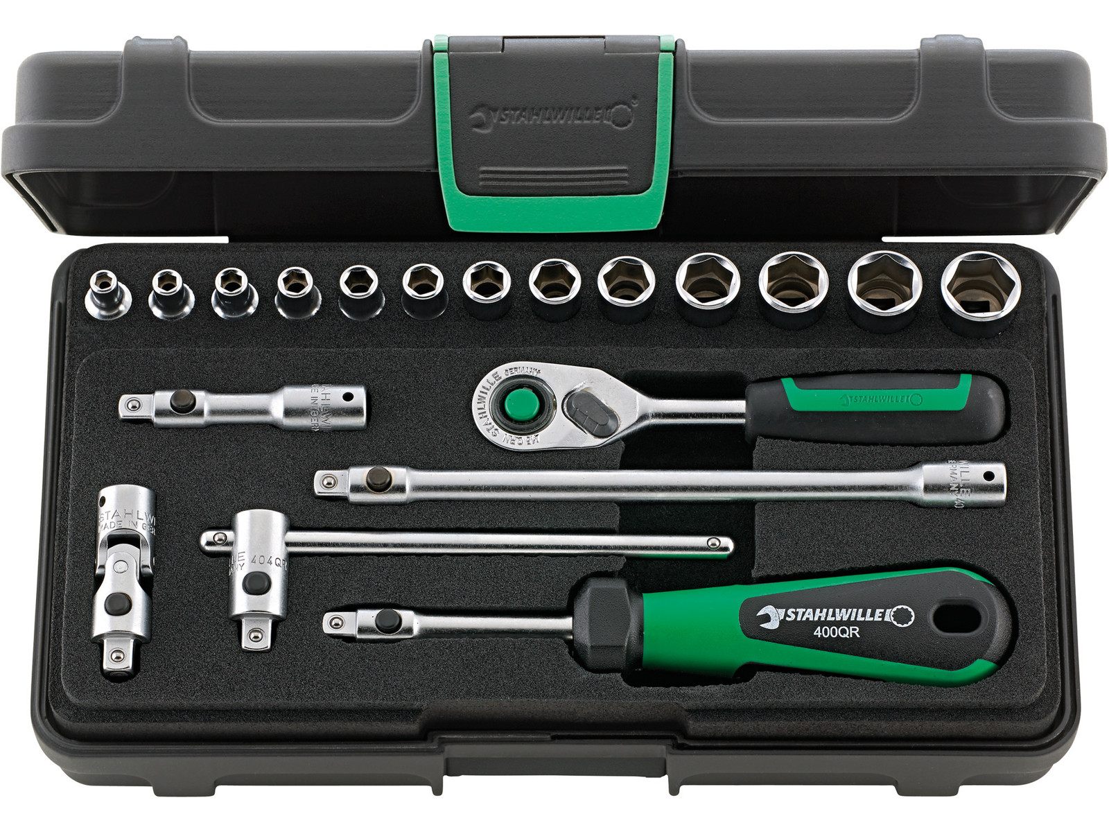 1/4" topnøglesæt med 19 dele. Indhold: 13 toppe med 6kt: 3,5 mm - 4,0 mm - 4,5 mm - 5,0 mm - 5,5 mm - 6,0 mm - 7,0 mm - 8,0 mm - 9,0 mm - 10,0 mm - 11,0 mm - 12,0 mm - 13,0 mm, skraldenøgle med Quick Release sikkerhedslås, 2 forlængere hhv. 54 mm og 150 mm, kardanled, topnøglegreb, samt T-greb. Leveres i robust, stabelbar ABS-kunststofboks.