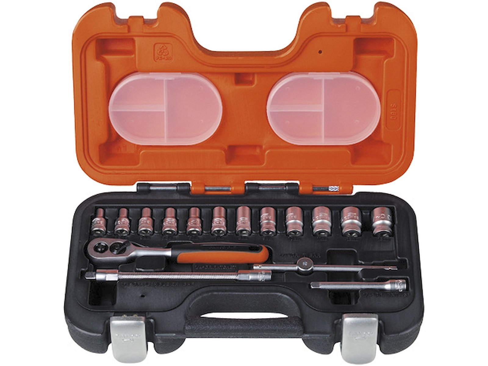1/4" topnøglesæt. Højtlegeret stål. Matforkromet. ISO 1174. DIN 3120. Kuffert i slagfast, olie- og temperaturbestandig plast. Indeholder 16 dele. 12 stk. 1/4" 6kt-toppe: 4, 4.5, 5, 5.5, 6, 7, 8, 9, 10, 11, 12 og 13 mm. 1 stk. 1/4" skraldenøgle med tokomponent håndtag, 60 tænder og en arbejdsvinkel på 6°. 1 stk. 1/4" t-nøgle 100 mm. 1 stk. 1/4" forlænger 75 mm. 1 stk. 1/4"åfleksibel forlænger 150 mm. 2 stk. udtagelige opbevaringsbokse med låg.