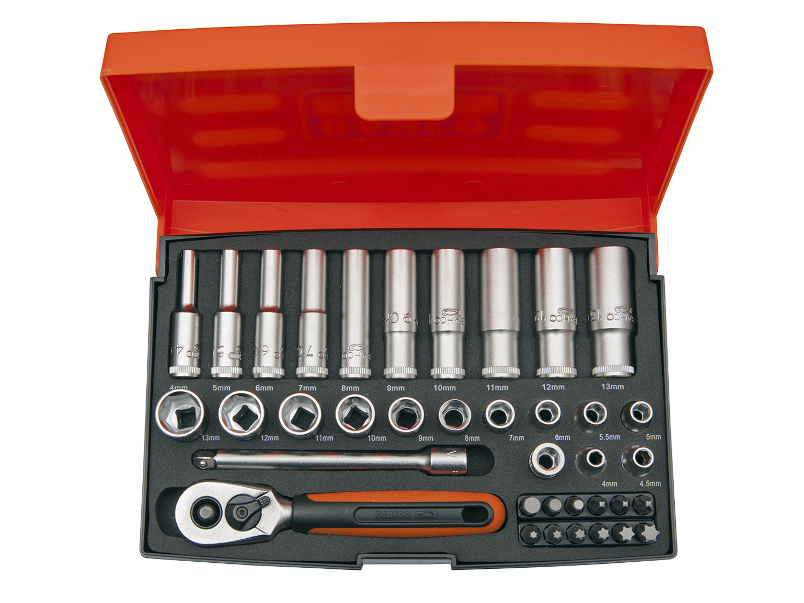 Indeholder lange og korte toppe 4-13 mm, stubby skraldenøgle, bits-adapter, forlænger og diverse bits.