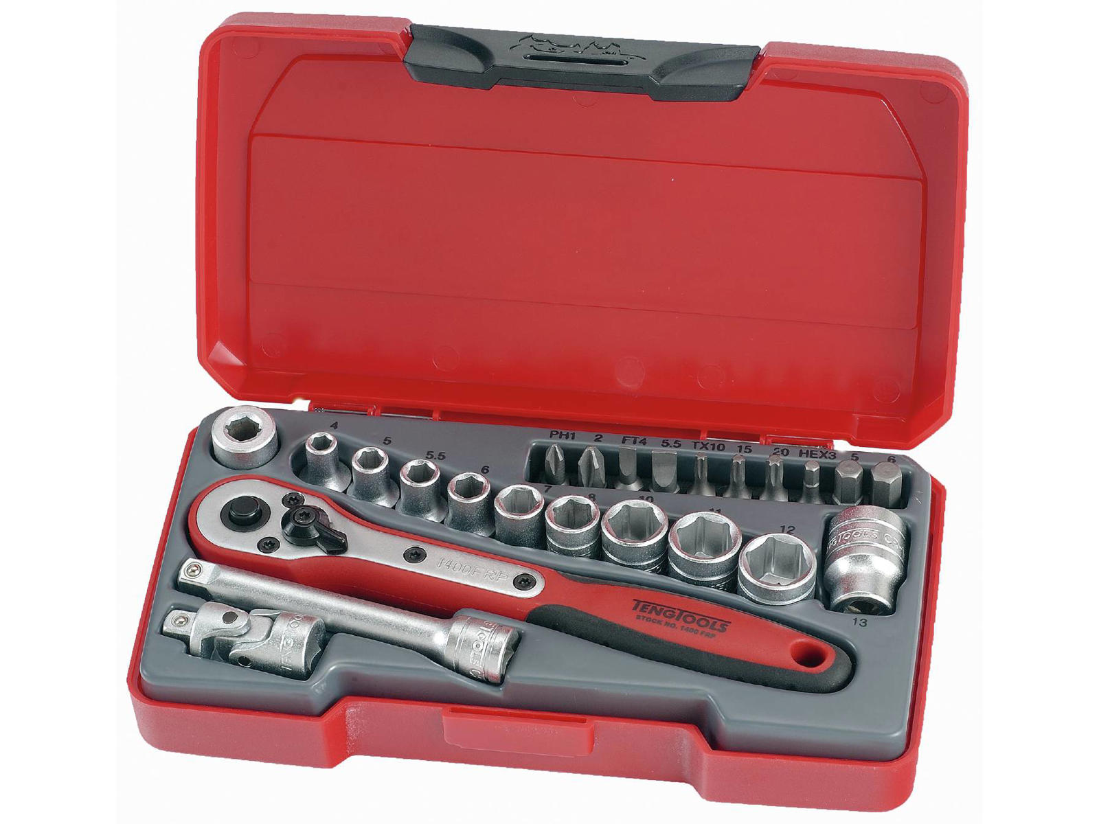 Sæt med 24 dele. Indeholder 10 sekskanttoppe, fiberforstærket skraldehåndtag, bitstop, forlængerstykke 75 mm, kardanled samt 10 bits.