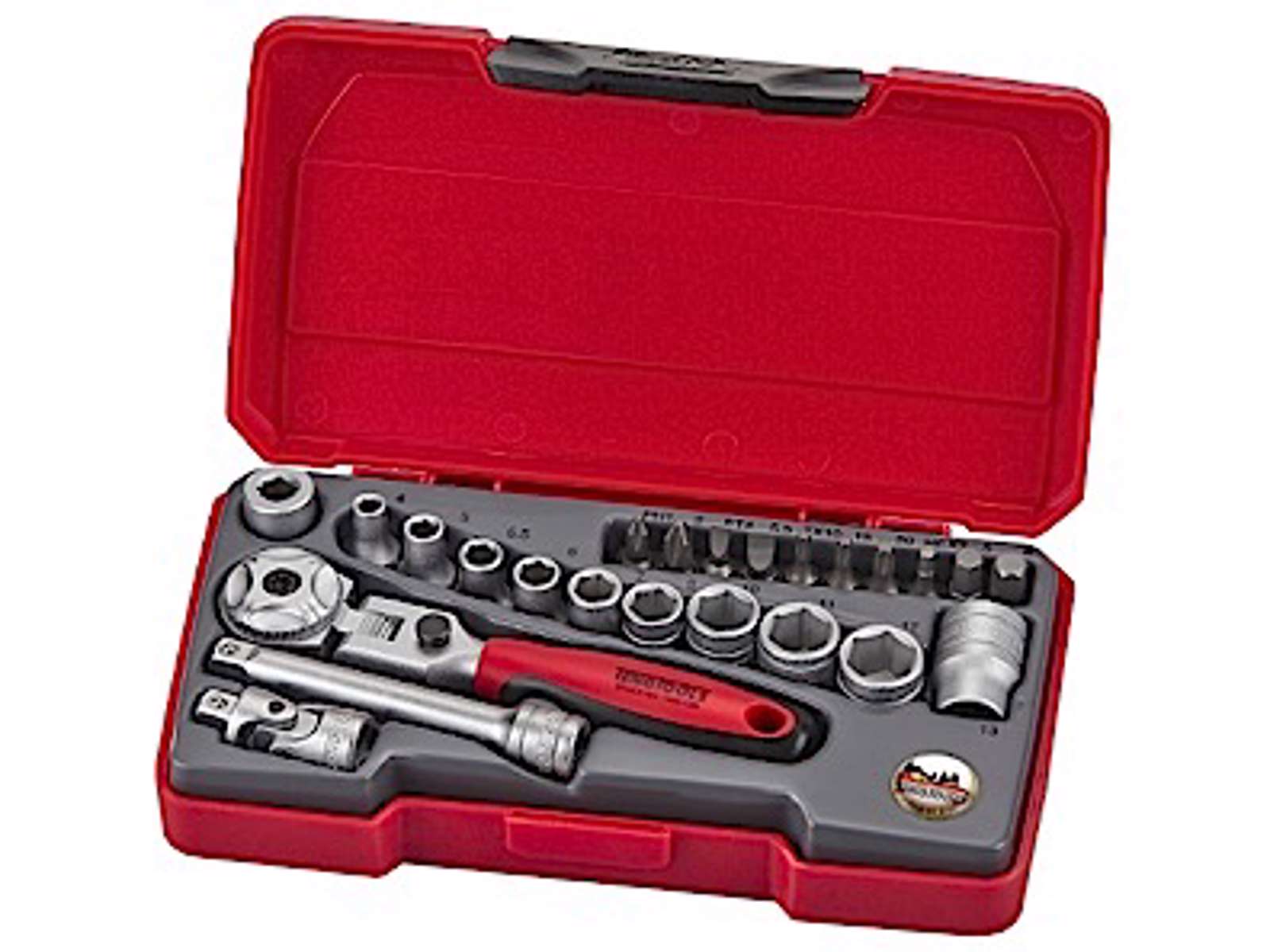 | Teng Tools 1/4" topnøglesæt med 24 dele. Indeholder et 72-tænders skraldehåndtag med fleksibelt hoved, der giver god adgang på snæver plads, 10 toppe 4 ? 13 mm, 10 bits, bitstop, forlænger samt kardanled. Leveres i lille og fleksibel æske med Quicklås og hængsler med metalstifter, der giver lang holdbarhed. |