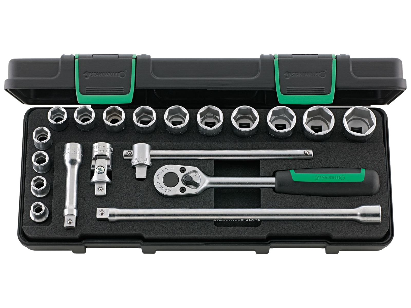 3/8" topnøglesæt med 19 dele. Indhold: 14 toppe med 6kt: 8,0 mm - 9,0 mm - 10,0 mm - 11,0 mm - 12,0 mm - 13,0 mm - 14,0 mm - 15,0 mm - 16,0 mm - 17,0 mm - 18,0 mm - 19,0 mm - 21,0 mm - 22,0 mm, skraldenøgle, 2 forlængere hhv. 76 mm og 240 mm, T-greb, samt kardanled. Leveres i robust, stabelbar ABS-kunststofboks.