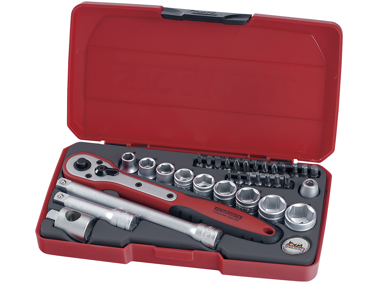 Teng Tools Sæt med 34 dele. Indeholder 9 korte sekskanttoppe, fiberforstærket skraldehåndtag, 75 og 150 mm lange forlængerstykker, reduktionstap 1/2" ? 3/8", bitstop samt 17 bits.