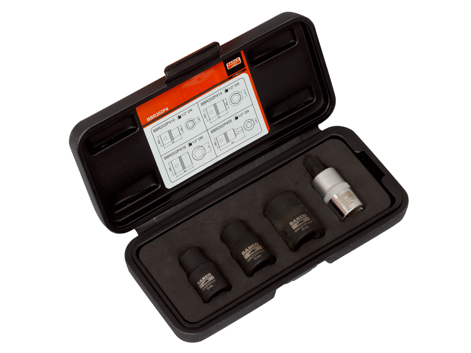 1/2" femkanttop og -bitsæt til håndbremse BBR202P4. Bruges til justering og montering af de fleste Girling- og Bendix-håndbremsesystemer. Sættet indeholder femkanttoppe: 10 mm, 14 mm og 19 mm. 10 mm topbitsholder samt 1/2" indfæstning. Komplet sæt til hovedparten af den europæiske bilpark. Nem at anvende sammen med en hydraulikskraldenøgle. Højlegeret stål i sort fosfateret udførelse. Komponentliste inkluderet i kassen. Leveres i formstøbt taske, med skumindlæg for bedre værktøjskontrol.