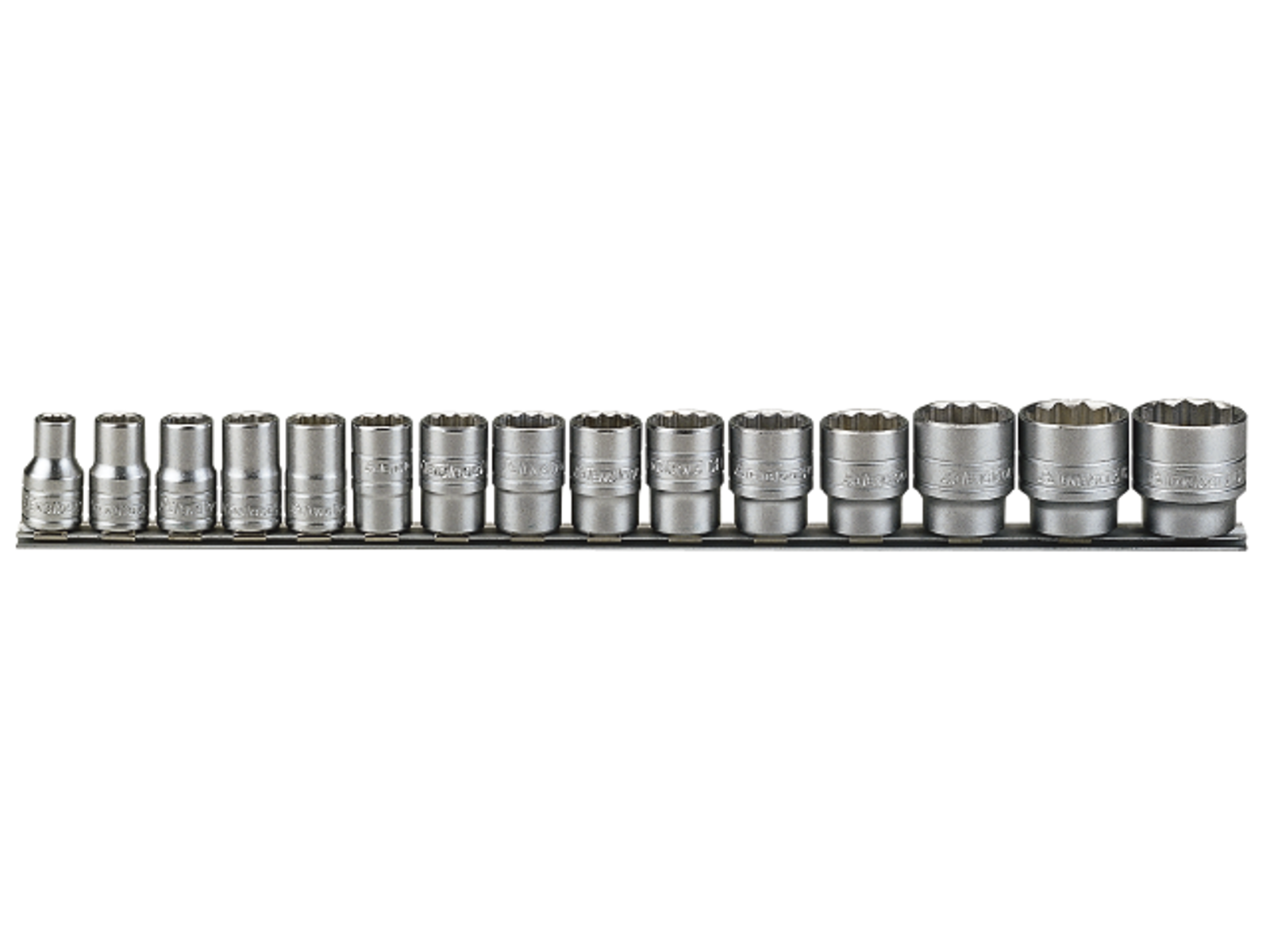 Teng Tools Sæt med 15 tolvkantede toppe af kromvanadiumstål. Monteret på clip-holdere med top-clips. Til placering på væg. Matforkromede.