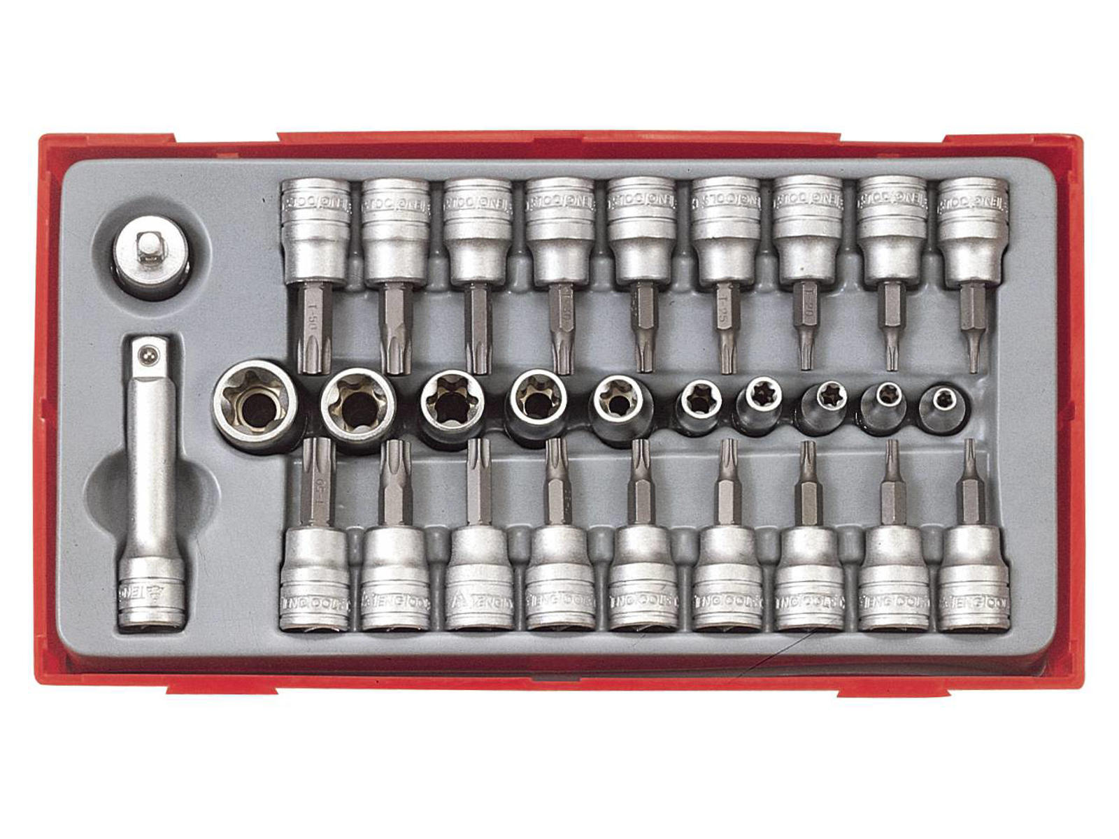 Topbitssæt med 30 dele. Består af reduktionstap 3/8"-1/4", forlængerstang 3/8" længde 75 mm samt 28 topbits til indvendig og udvendig TX-kærv.