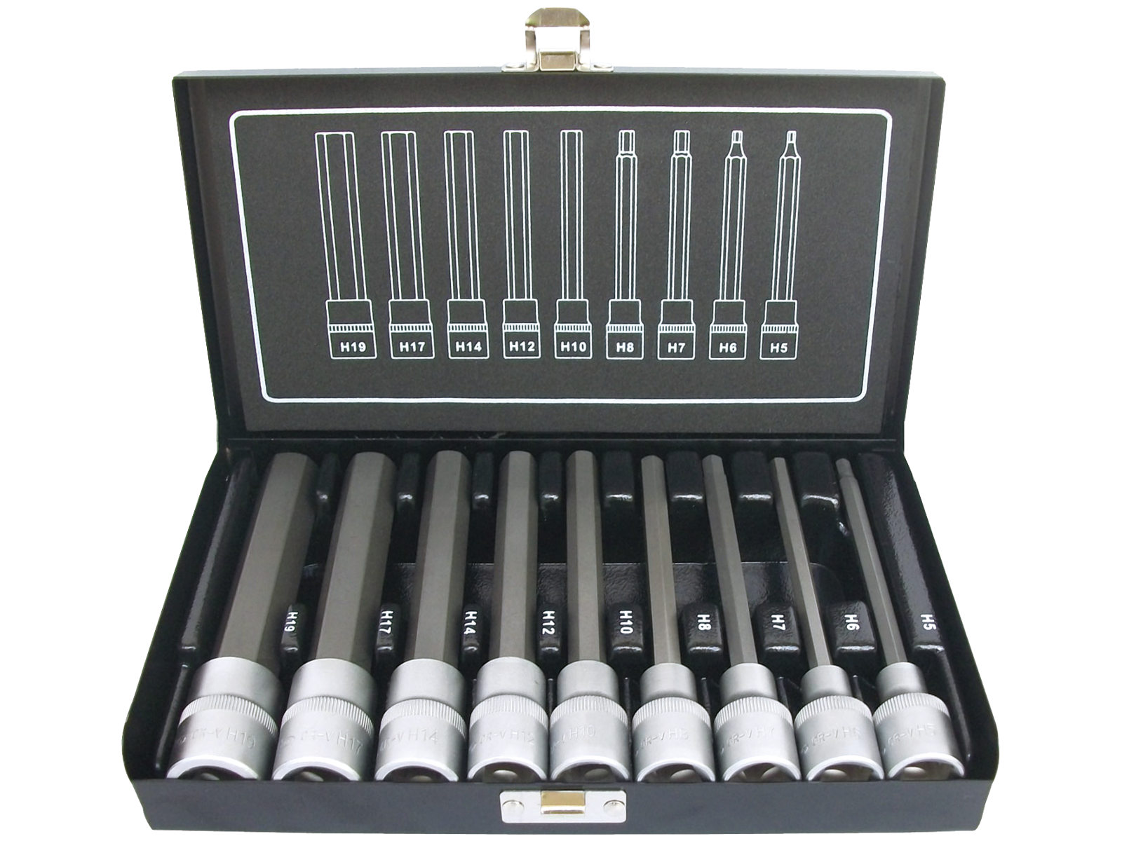 Stifttopsæt med 9 dele. 1/2" 6kt stifttoppe 140 mm lange. Indhold: 5,0 - 6,0 - 7,0 - 8,0 - 10,0 - 12,0 - 14,0 - 17,0 - 19,0 mm. Leveres i metalboks.