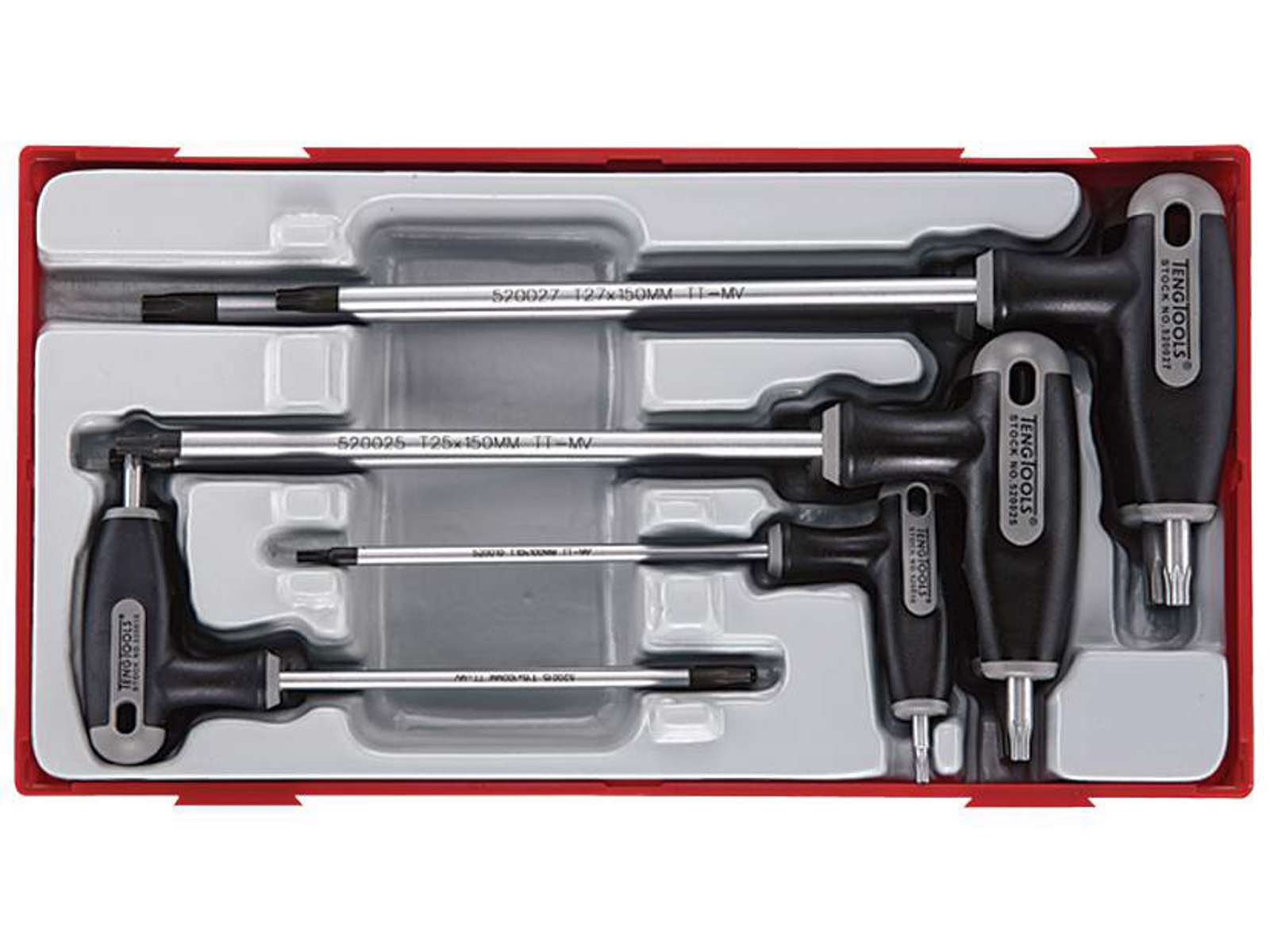 Sæt med 7 TX-nøgler med T-håndtag. Til indvendige kærve iht. TX-systemet (den lange nøgleende også til skruer med centerspids).