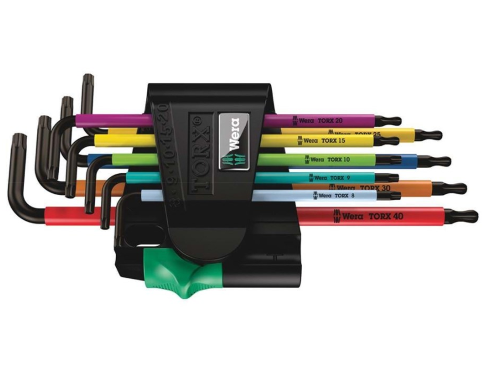 Stiftnøglesæt med 9 dele. Stiftnøgle med farvekodet plastbelægning for hurtig identifikation. Til Torx og Torx BO (med boring) -skruninger. Kuglen på den lange arm tillader sikkert arbejde også i vanskelige montagesituationer. BlackLaser-overfladebehandling sikrer god overfladebeskyttelse, også mod korrosion, og lang levetid. Ergonomisk og bekvemt greb skåner hænderne også ved lave temperaturer. Laserpåført og slitageresistent størrelsesmærkning på nøglen. Sættet indeholder nøglerne: TX8 og TX9 uden boring og kuglehoved, TX10 uden kuglehoved, TX15, TX20, TX25, TX27, TX30 og TX40. Leveres i praktisk holder.