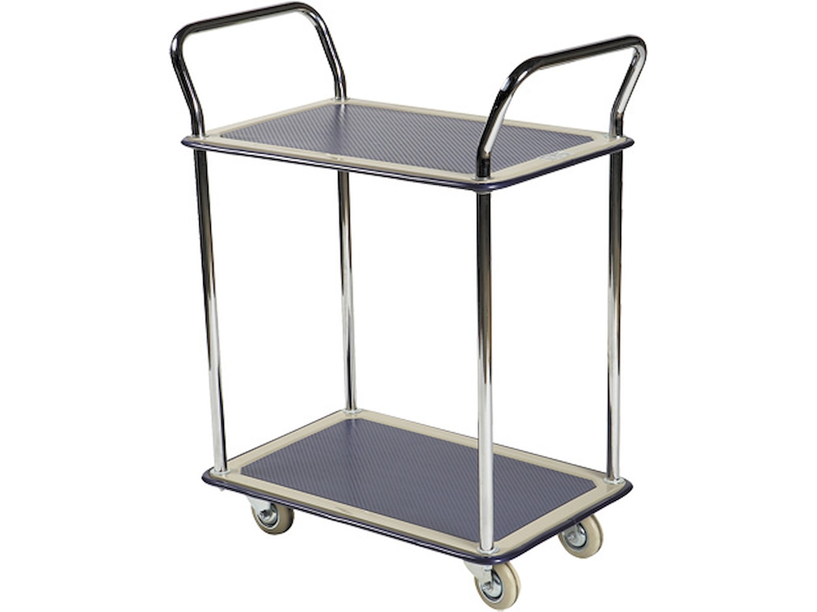 Robust og handy til lette transportopgaver på lageret eller kontor. Let at manøvrere, da den er udstyret med 2 drejelige og 2 faste massive gummihjul. Hylden er belagt med skridsikker belægning. Forkromet håndtag. Beskyttende stødfangere.