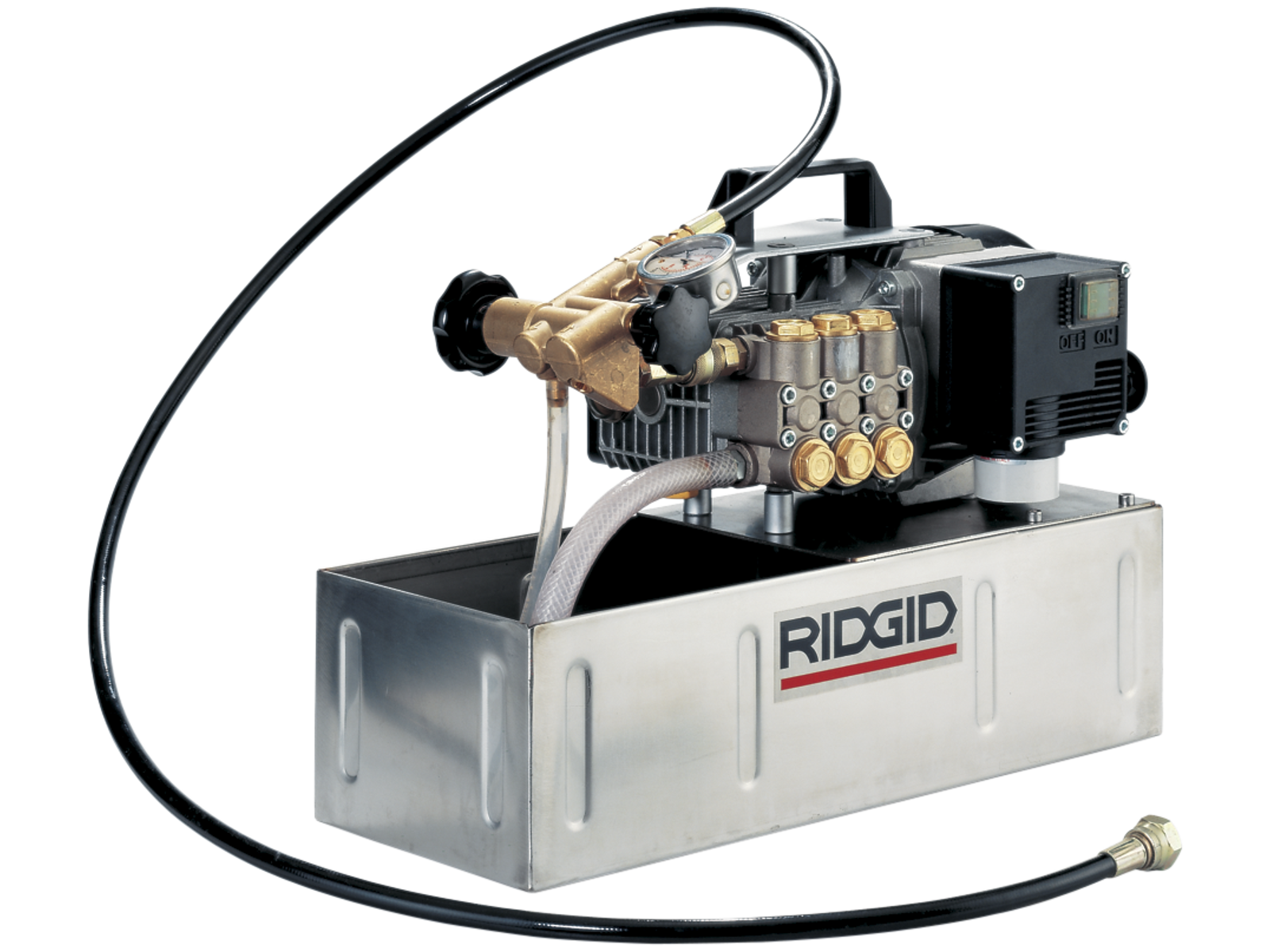 Keramisk stempelpumpe med 3 stempler, der giver langsom trykopbygning og længere levetid. Kvikkoblingssystem til frakobling af kontrolblok og manometer. Trykprøveenheden kan forblive sluttet til systemet, som trykprøves. Pumpen kan anvendes til trykprøvning af et andet system med en tilbehørskontrolblok. Beholder i rustfrit stål (syrefri væsker). Vandgennemstrømning: 9 ltr/min. Olie (SAE 30).