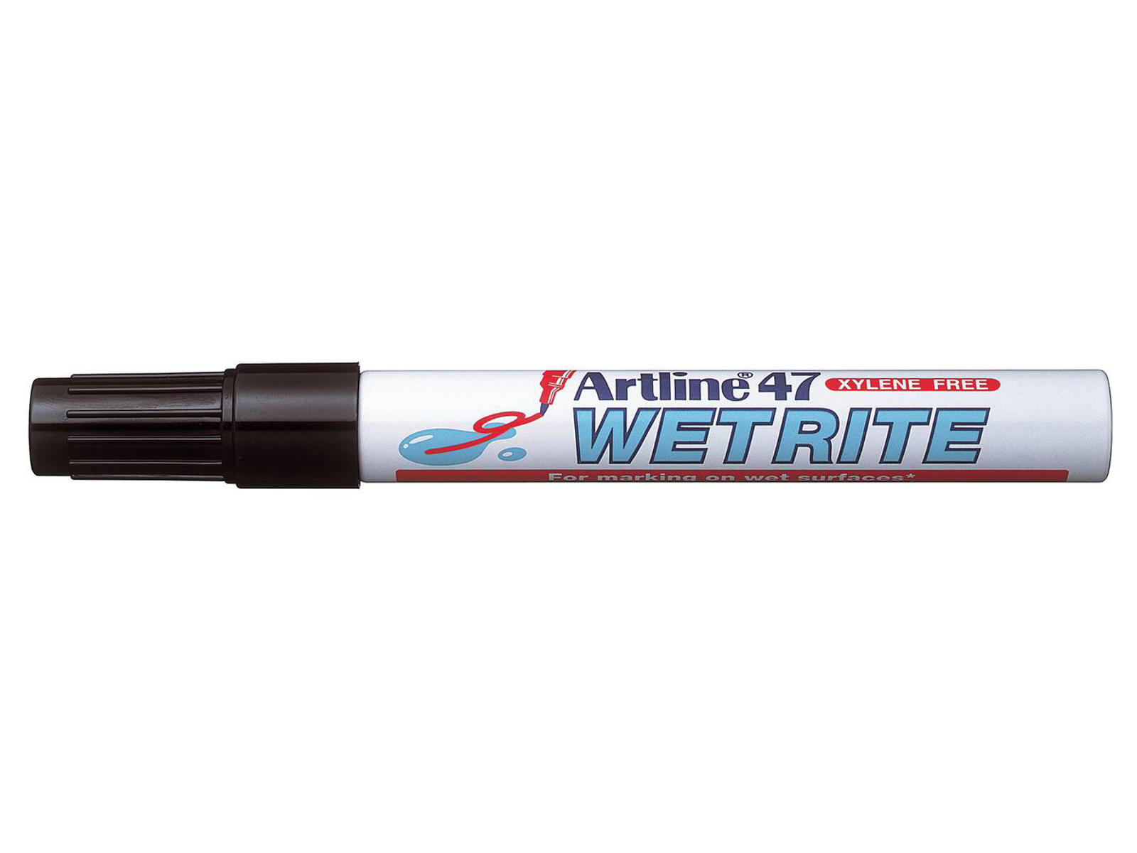Artline Markeringspen til at skrive og markere på våde underlag, også under vand. Ideel til mærkning på våde, ikke-porøse overflader som metal, plast, gummi, plade, strækfilm og frigolit mm. Pennen kan ikke bruges på vådt glas eller våde fliser. Pennens hus af slagfast aluminium. Næsten lugtfri. 1.5 mm rund akrylspids. Uden xylene.