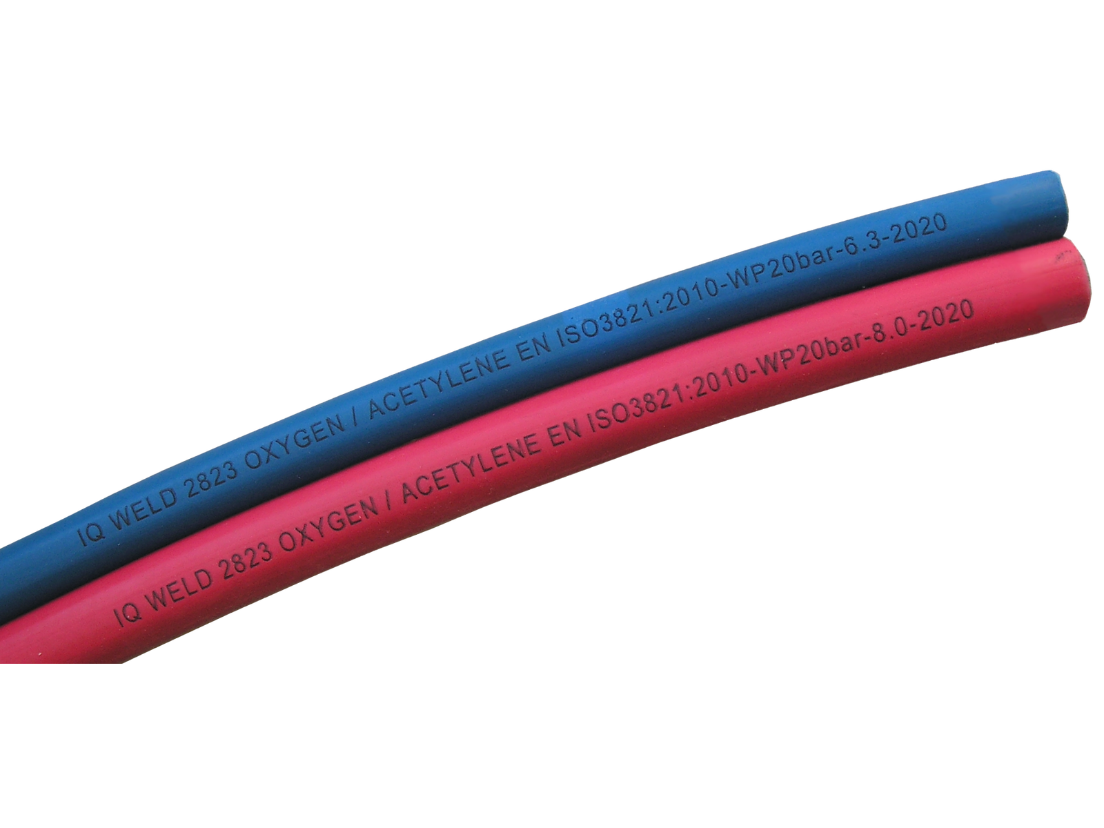 Rød/blå tvillinge svejseslange til acetylen og oxygen. Maks. arbejdstryk 20 bar. Pris pr. meter.