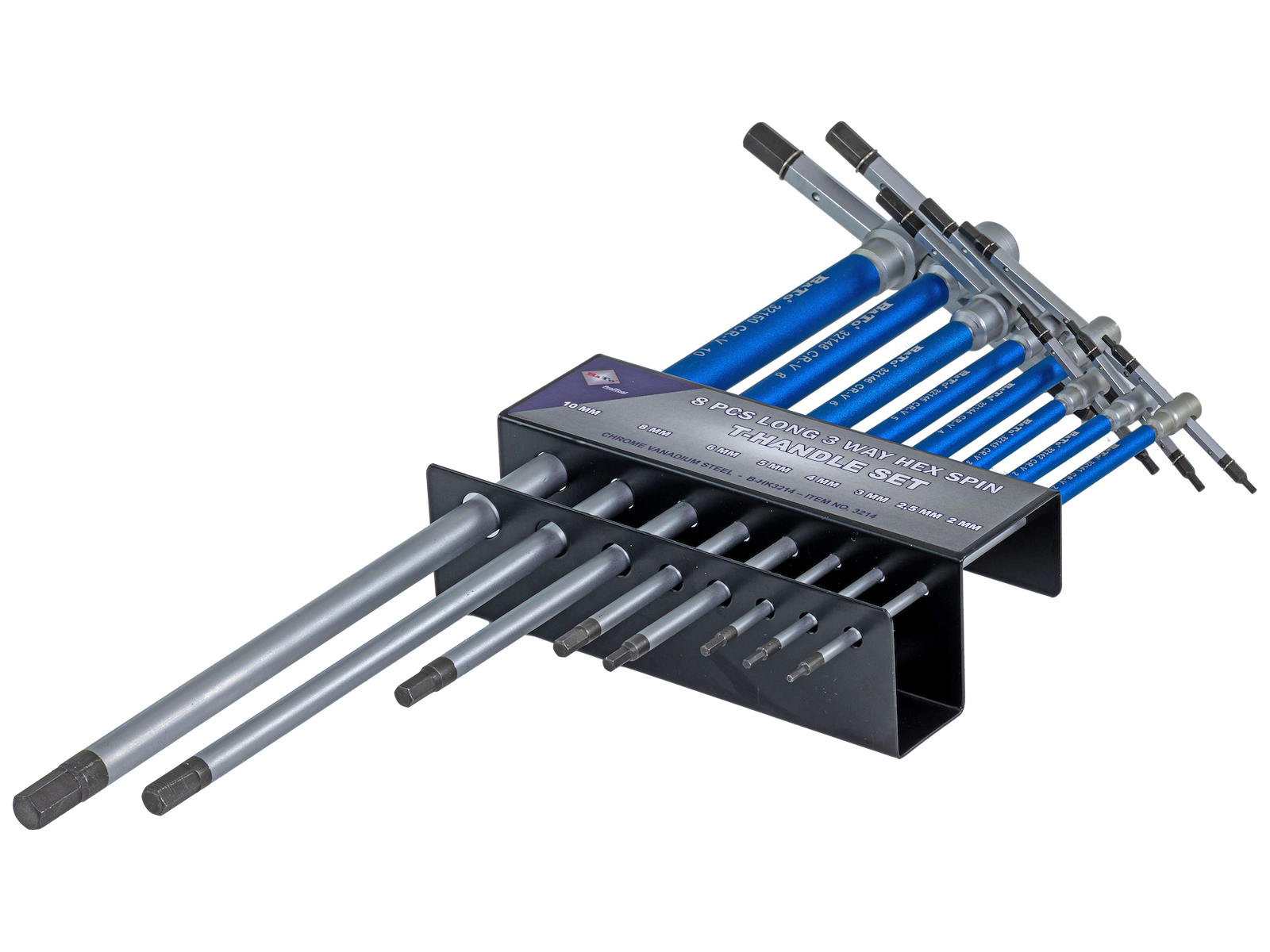 T-Greb stiftnøglesæt i ekstra lang udførelse med hånd-rullegreb. Sættet består af 8 nøgler str. 2,0 - 2,5 - 3,0 - 4,0 - 5,0 - 6,0 - 8,0 - 10,0 mm. Leveres med metalstand.