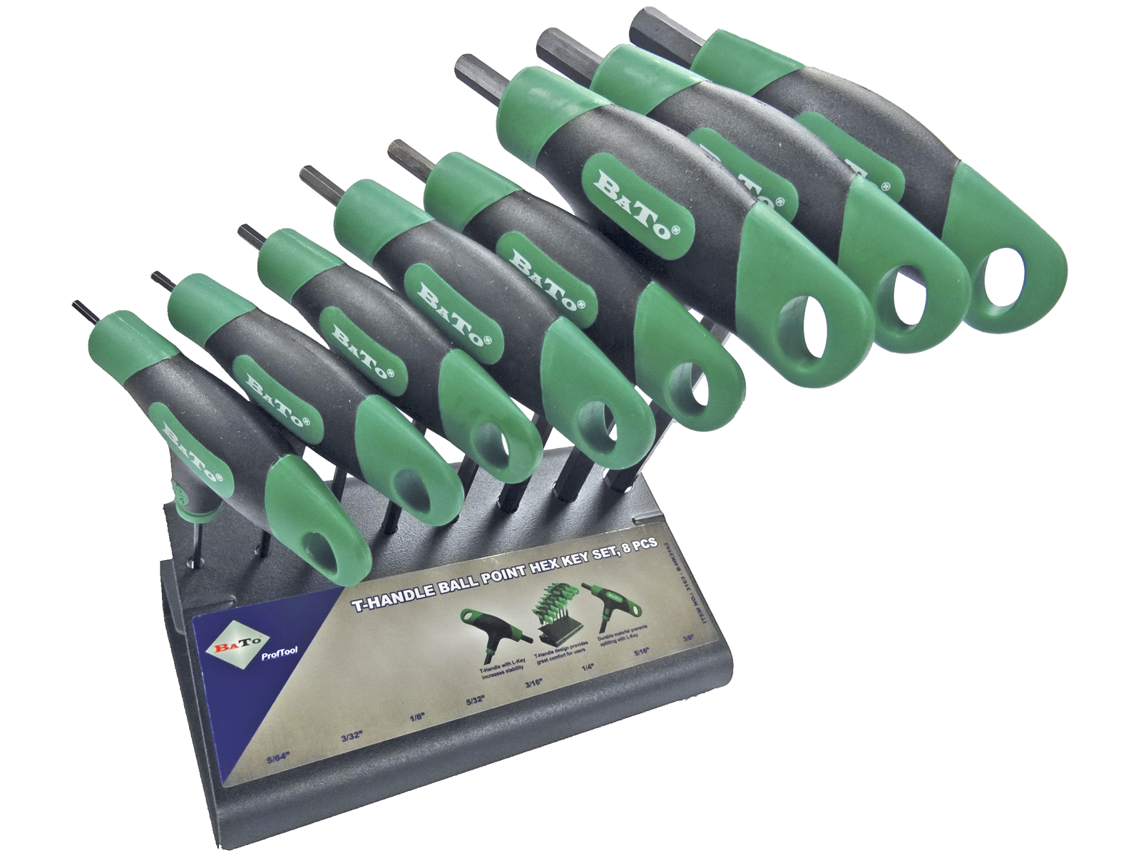 Stiftnøglesæt med 8 dele. T-grebs stiftnøgler med kugle. Sættet indeholder størrelserne 5/64, 3/32, 1/8, 5/32, 3/16, 1/4, 5/16 og 3/8" og leveres i metalstander. (5/64 uden kugle)