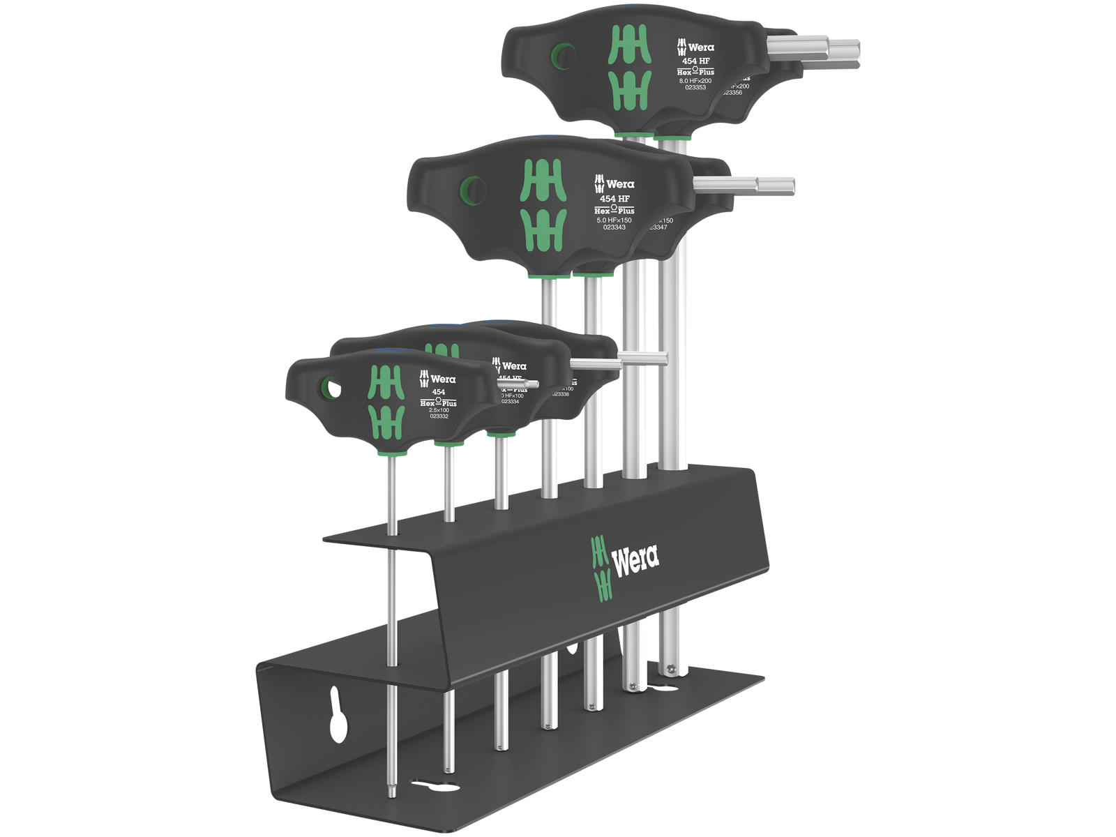 Sæt med 7 T-grebs nøgler til overførsel af særligt store spændings- og løsningsmomenter. Ergonomisk 2-komponent greb med fordybninger til fingrene og behageligt hold til meget stor kraftoverførsel og arbejde, der ikke trætter. Værktøjsfinder "Take it easy": Farvemarkering efter profiler og størrelsesmærkning. Med yderligere kort arm til overførsel af ekstremt store momenter via den lange arms vægtstangsvirkning, og med holdefunktion på den lange arm til at give skruen sikkert hold på værktøjet. Speciel overfladeforædling til stærk korrosionsbeskyttelse og optimal pasform i skruen. Inklusiv metalrack til opbevaring. Racken kan stilles på arbejdsbordet eller hænges op på værktøjsvæggen. Indhold: Hex-Plus 2,5×100 mm, Hex-Plus med holdefunktion 3×100 mm, 4×100 mm, 5×150 mm, 6×150 mm, 8×200 mm, og 10×200 mm.