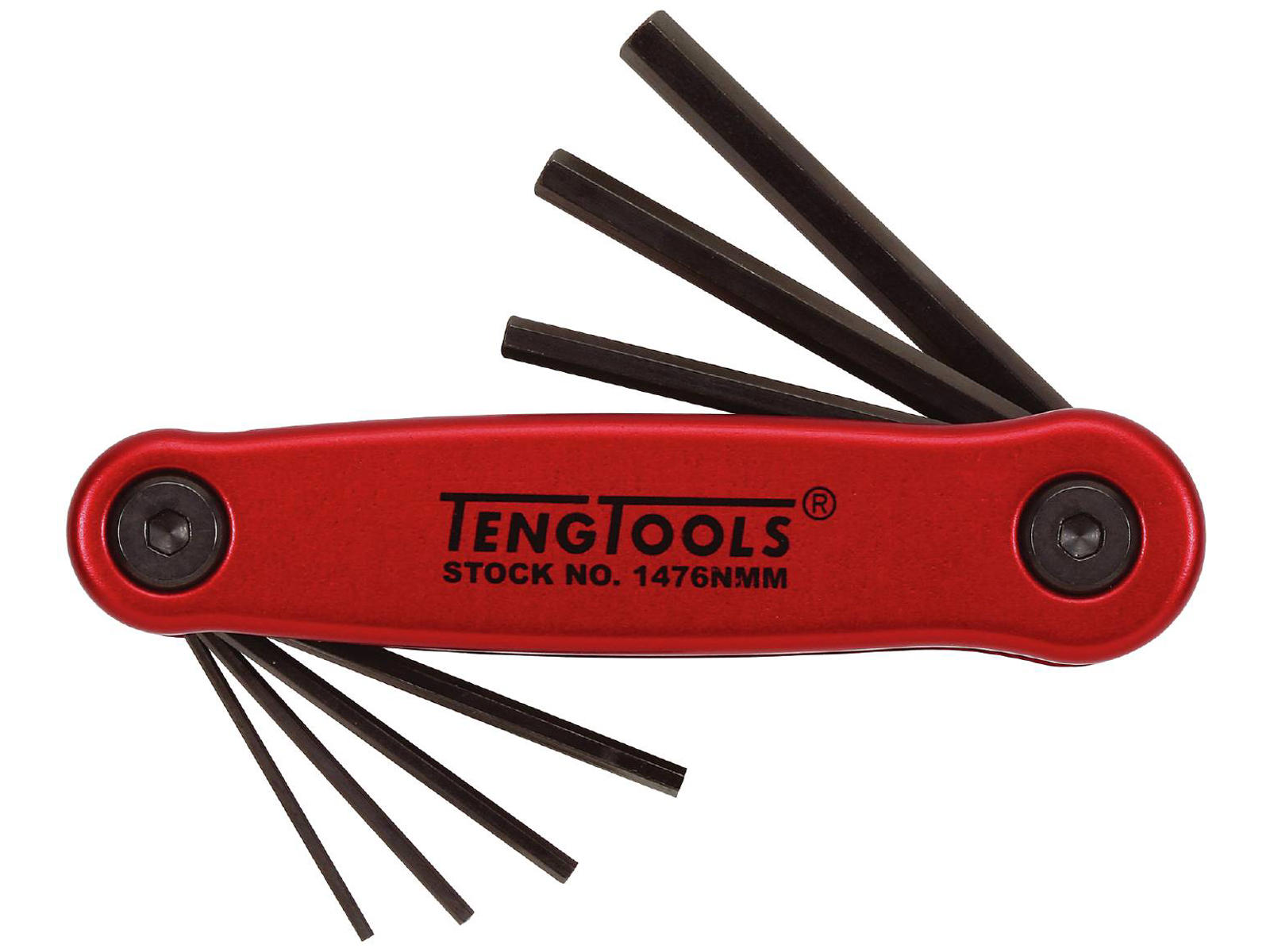 7 stk. unbraconøgler i sæt. Af kromvanadiumstål. Sorte. Indfældelige i håndtag af aluminium og nylon.