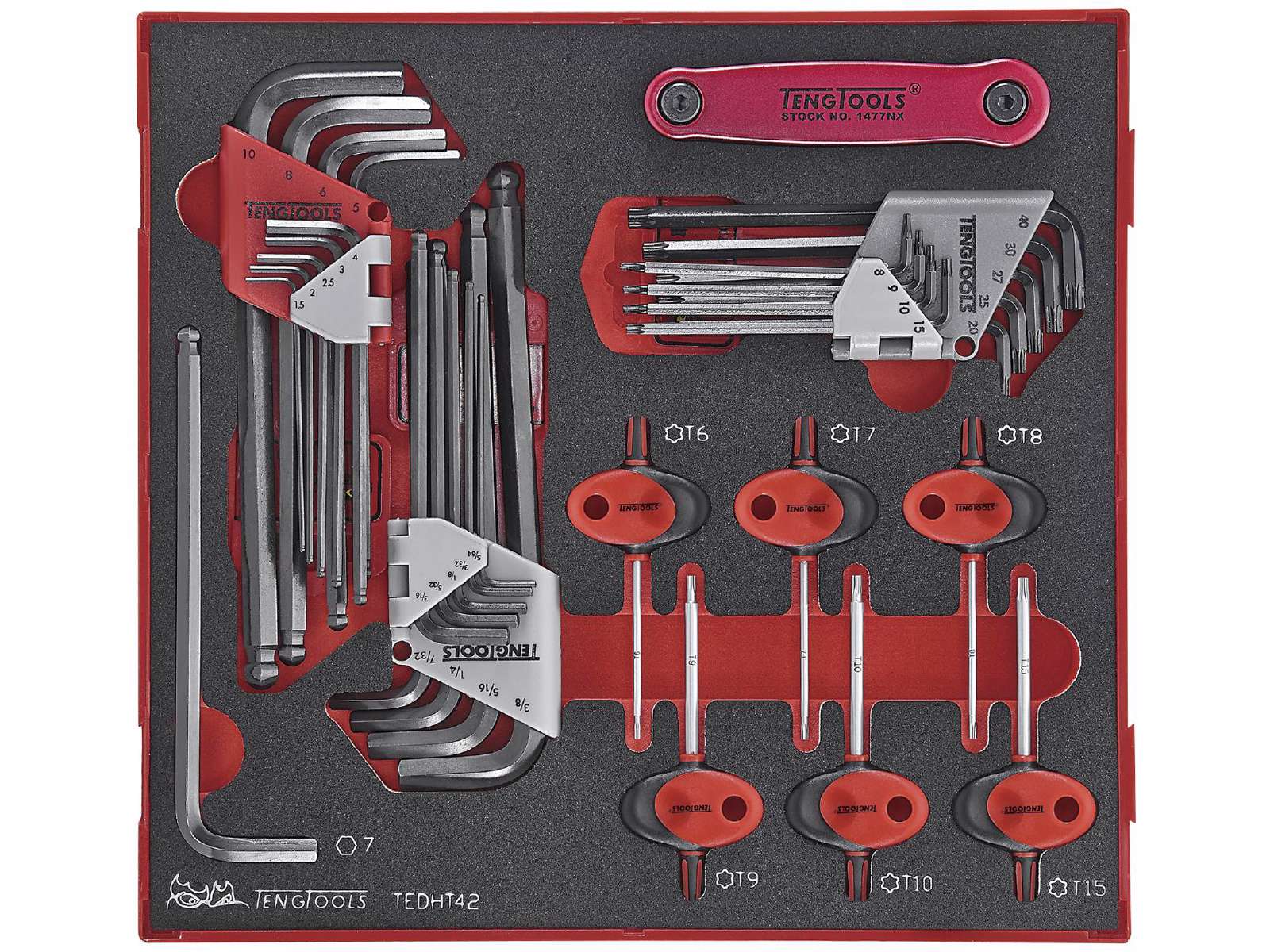 • Nøglesæt med 42 dele indeholdende to unbrakonøglesæt i mm og tommer (1479MM og 1479AF) et TX-sæt (1479TX), et sæt med sekskant-, TX-, lige kærv samt PH2 og PZ (1477NX), 6 TX-nøgler med T-skaft samt en 7 mm unbrakonøgle med kugle.