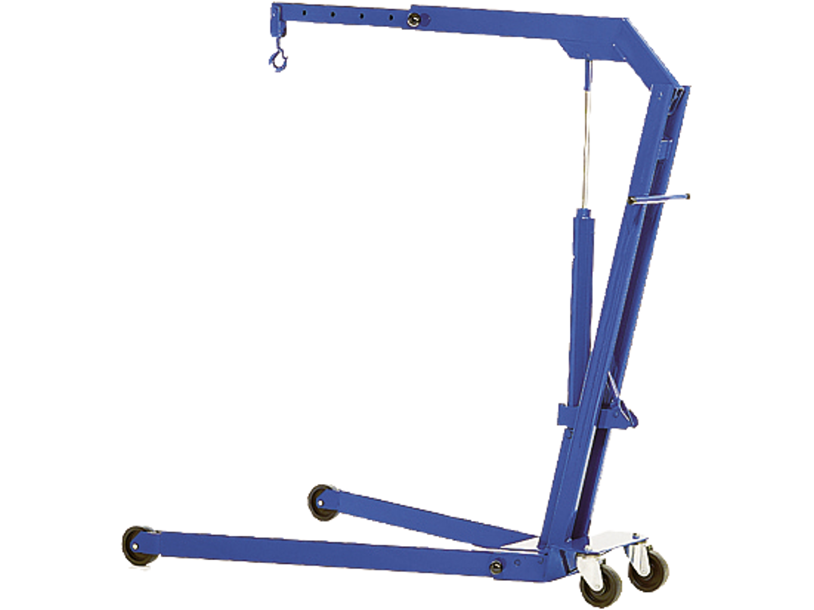 • Hydraulisk værkstedskran til autoværksteder og servicebiler. Kan foldes sammen på få sekunder for hurtig og nem opmagasinering. Sammenfoldet optager kranen minimalt plads på værkstedsgulvet. Udtræksarm med stor løftekapacitet, også i yderste position. Hårdtforkromet stempelstok og pumpestempel sikrer lang levetid. Indbygget sikkerhedsventil sikrer mod overbelastning. 360° svingbare baghjul sikrer, at kranen er manøvredygtig, også med fuld last. Forsynet med 360° drejelig krog. Håndbetjent dødmandsudløser giver optimal sikkerhed ved sænkning.