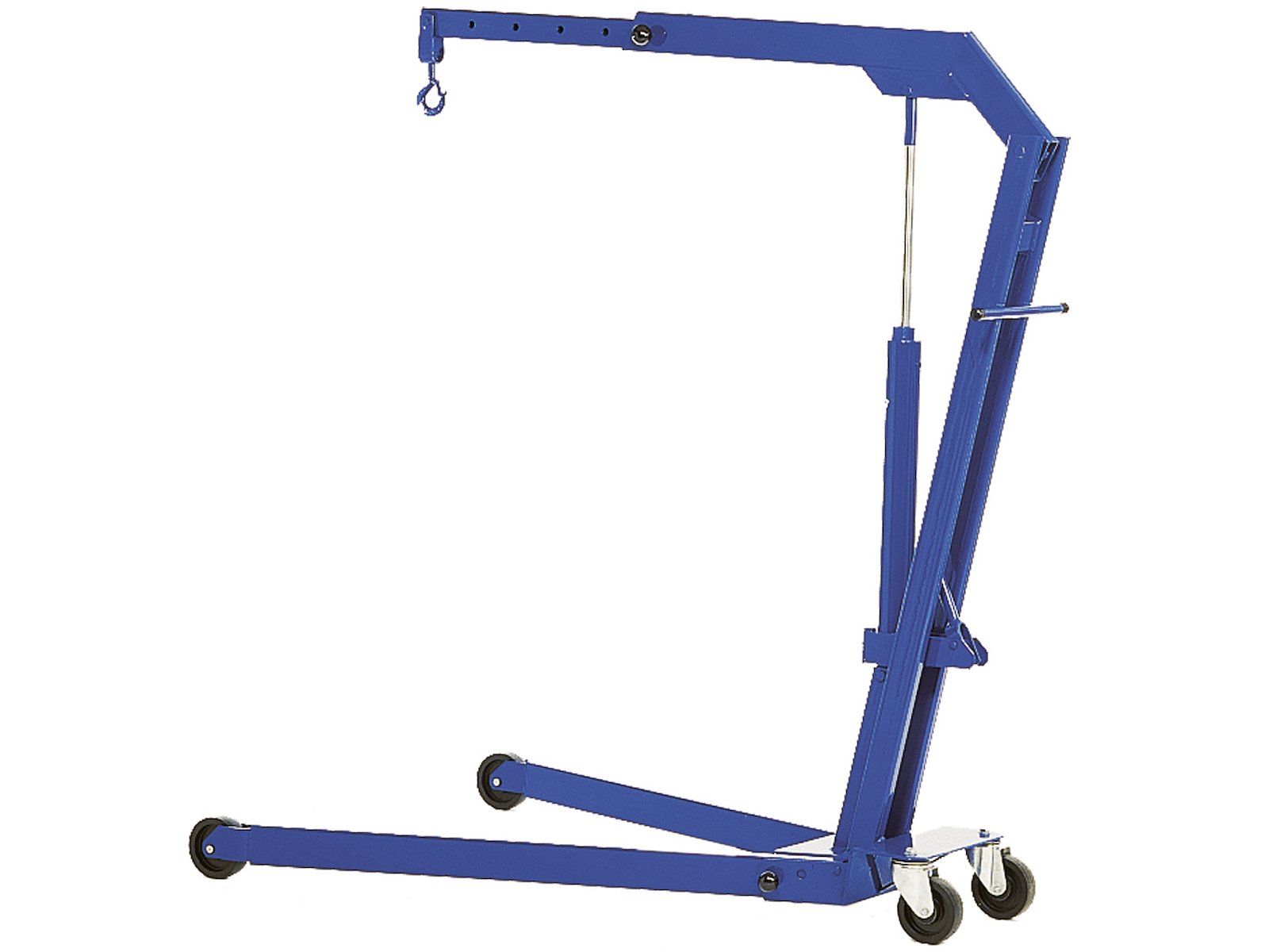 Hydraulisk værkstedskran til autoværksteder og servicebiler. Kan foldes sammen på få sekunder for hurtig og nem opmagasinering. Sammenfoldet optager kranen minimalt plads på værkstedsgulvet. Udtræksarm med stor løftekapacitet, også i yderste position. Hårdtforkromet stempelstok og pumpestempel sikrer lang levetid. Indbygget sikkerhedsventil sikrer mod overbelastning. 360° svingbare baghjul sikrer, at kranen er manøvredygtig, også med fuld last. Forsynet med 360° drejelig krog. Håndbetjent dødmandsudløser giver optimal sikkerhed ved sænkning.