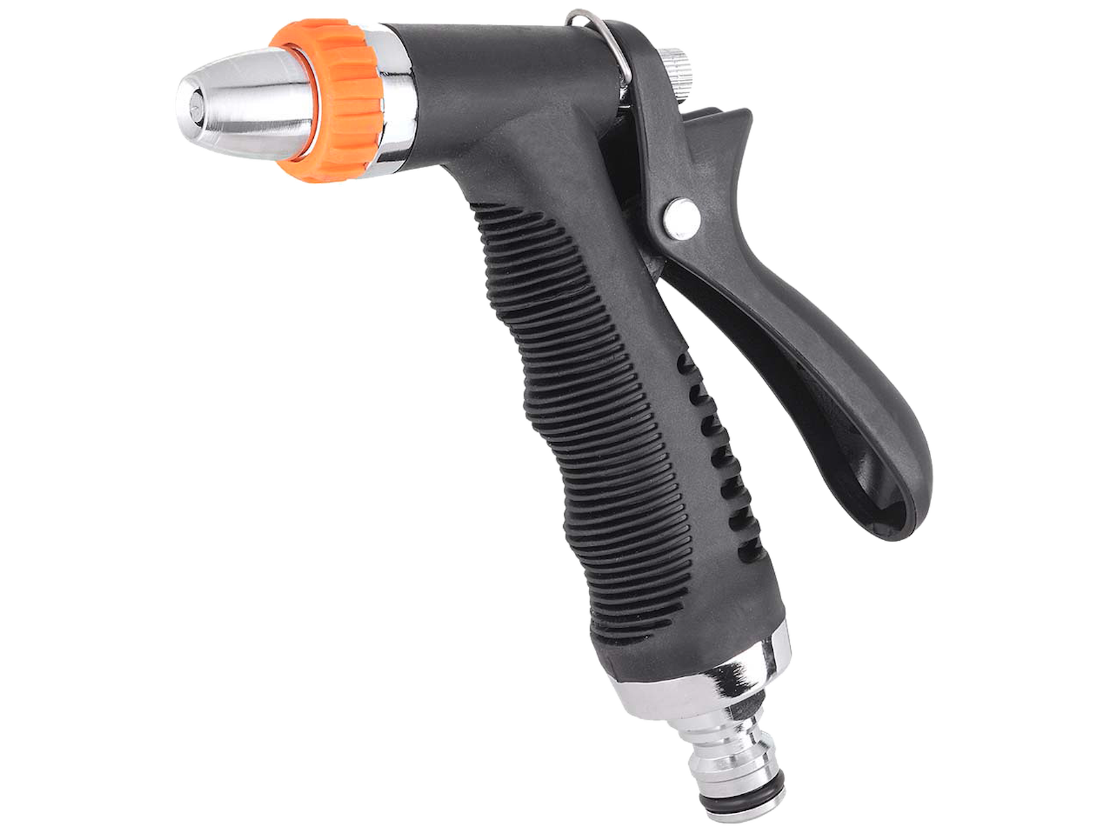 Sprøjtepistol i forkromet metal. Ergonomisk gummi greb. Flowafbryder og lås for ønsket stråle. Quick-Click kobling.