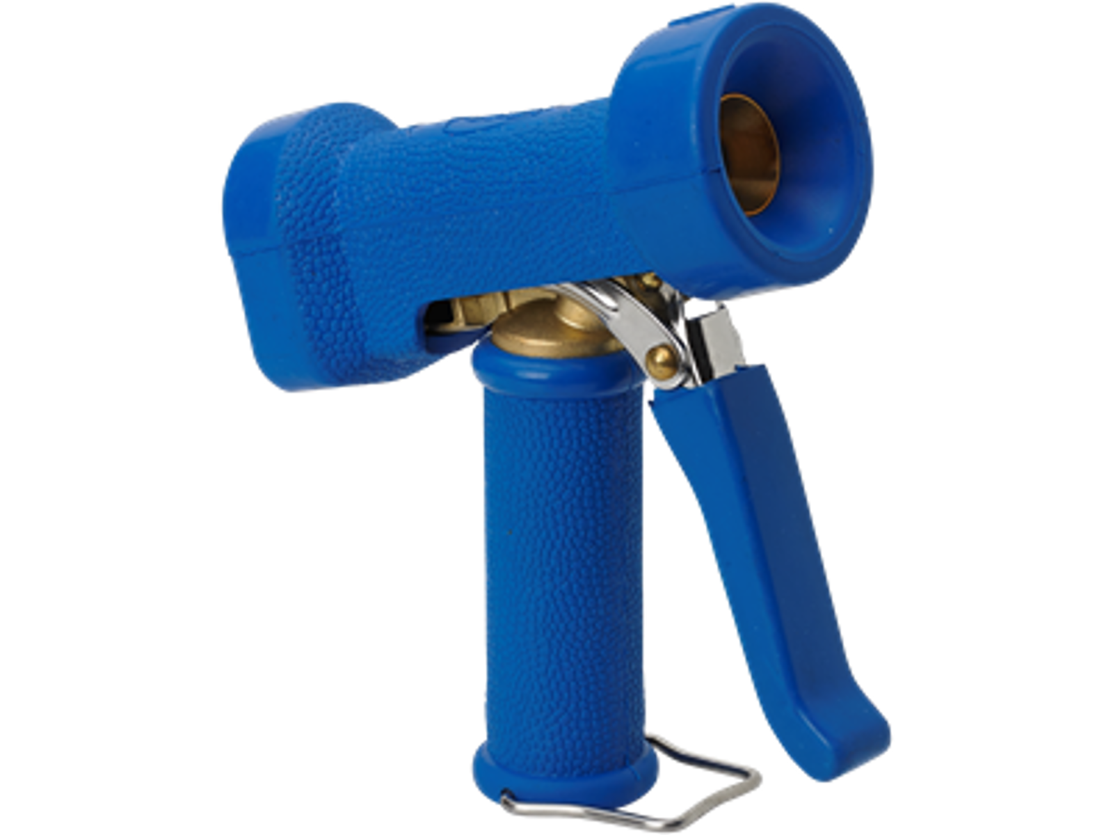 Slagfast industripistol til skylning af gulve og maskiner. Vandmængden kan justeres ved tryk på den gummiisolerede aftrækker og vandstrålen kan justeres ved hjælp af justeringsskruen i enden af pistolen, så samme vandmængde og spray sikres under arbejdet. For at montere slangen på pistolen skal der monteres en 1/2" eller 3/4" kobling på pistolen. Fås i flere varianter.