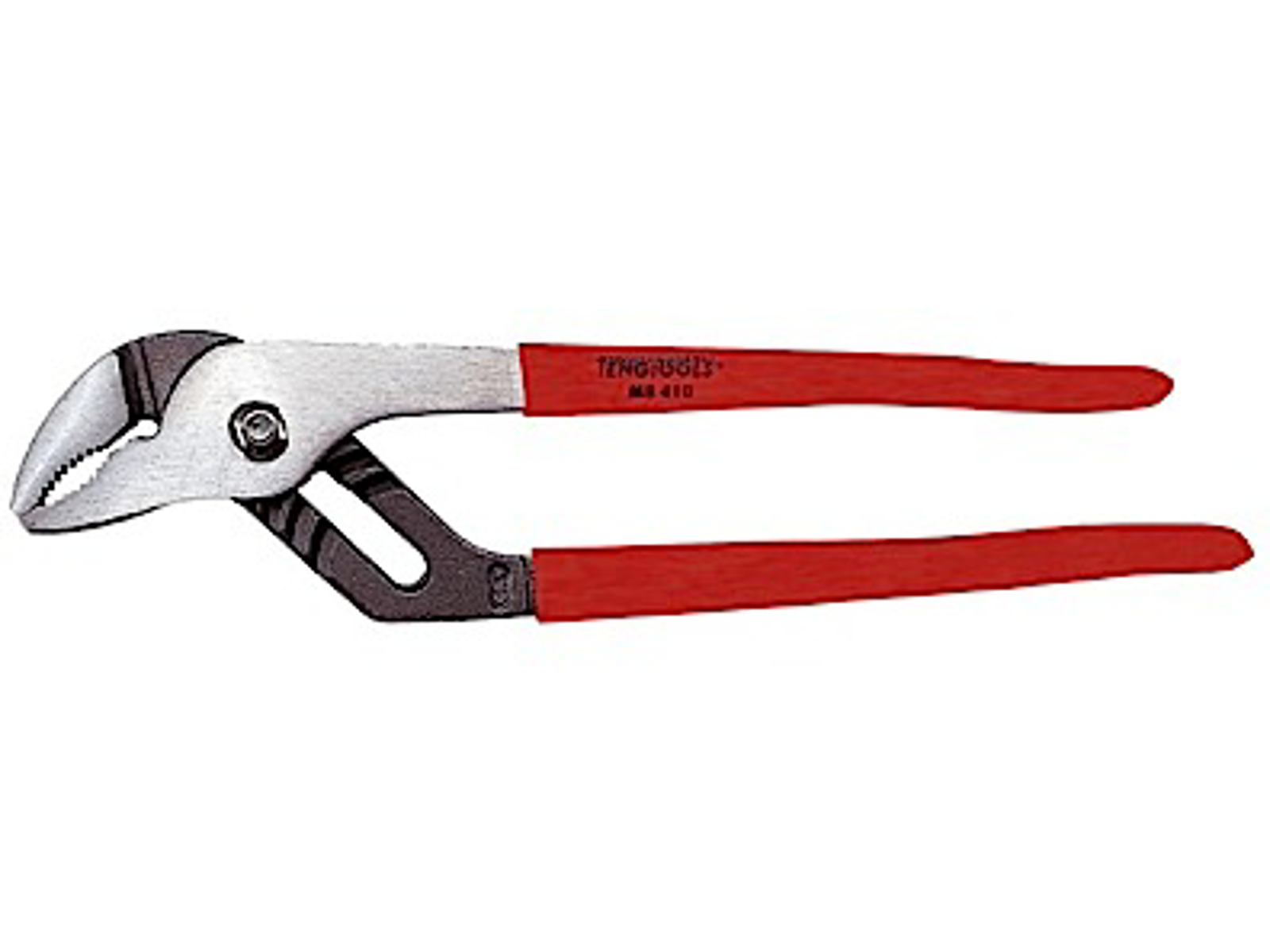 Kraftig model. Af kromvanadiumstål. Riflede parallelle kæber. Glideled med buede styreriller. Poleret hoved. Plastbeklædte håndtag.