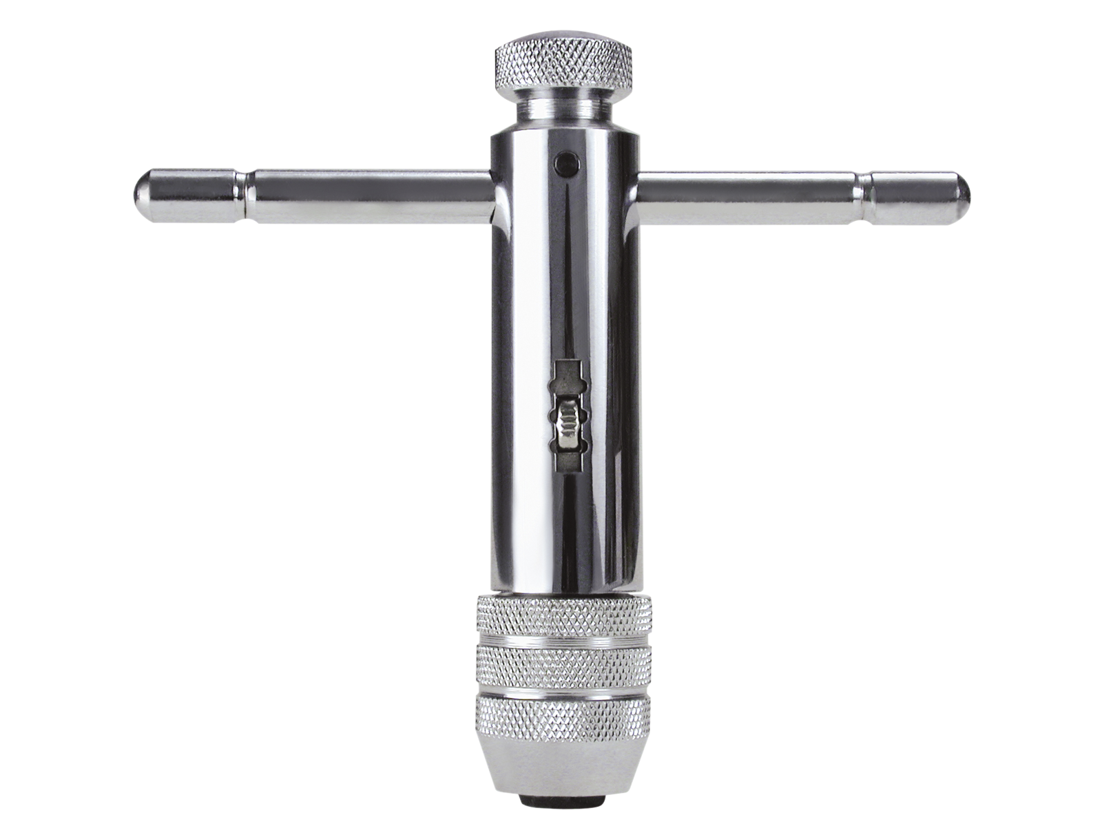 Værktøjsholder med skralde. Ideel til gevindskæring på svært tilgængelige steder. Dobbeltkæbe til firkantskaft. Udførelse: Stilbar til højre, venstre og fast. Skaft med forskydeligt tværgreb med riller i begge ender. Overflade: Forkromet.