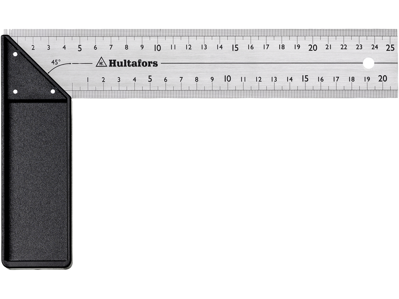 Vinkel med anslag i glasfiberarmeret ABS plast og millimetergradering i over- og underkant på klingen. Klingen er fremstillet i 1,0×45 mm rustfrit stål. Anslag i glasfiberarmeret ABS plast med 18 mm bred anlægsflade. Graderingen er dybtætset og meget modstandsdygtig overfor slitage.