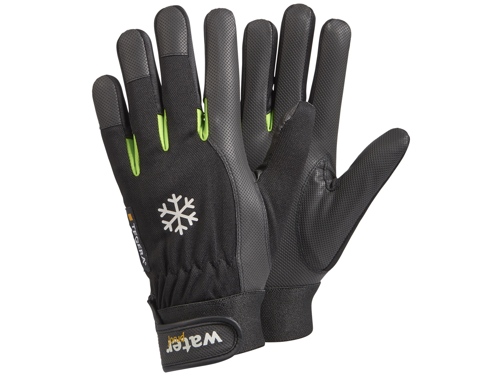Vinterforet, kuldebeskyttende kunstlæderhandske. 0,7 mm tyk håndflade med vind- og vandtæt polyester-håndryg. Fleece-for. Forstærkede fingre. Kromfri. Kort model med velcrojustering i håndled. Sort med grønne markeringer. Til præcisions-arbejde. Kategori II.